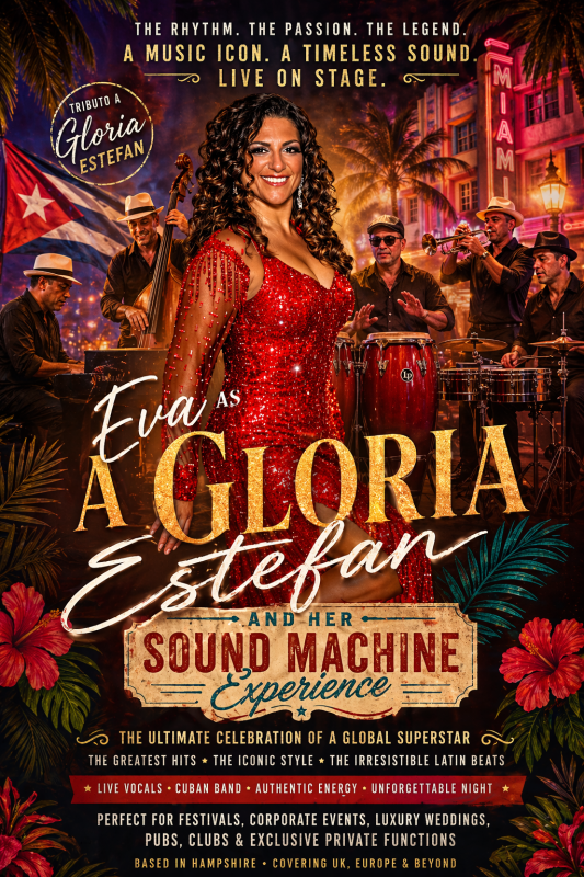 Based in Hampshire and available across the UK, Europe, and beyond, A Gloria Estefan Experience is perfect for festivals, corporate events, luxury weddings, pubs, clubs, and exclusive private functions