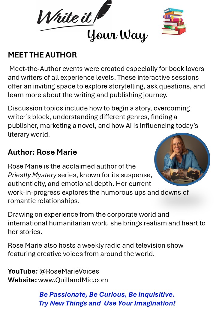 The magic of words ignites excitement and builds anticipation—especially as a Master of Ceremonies at festivals, where I energize audiences for every act. With over 15 years of experience interviewing guests on TV, radio, and live events, I bring sharp communication, quick adaptability, and seamless event flow.Being an MC is more than announcements—it’s about owning the energy, pacing, and transitions that keep events running smoothly and audiences fully engaged. I’ve led intimate gatherings and captivated crowds of thousands, handling glitches, delays, and surprises with calm confidence.I read the room, drive the vibe, and make every event unforgettable.Explore videos of my speaking engagements across diverse settings on my YouTube channel @RoseMarieVoices, my website Quill and Mic, and my Facebook page at www.facebook.com/Author.RoseMarie